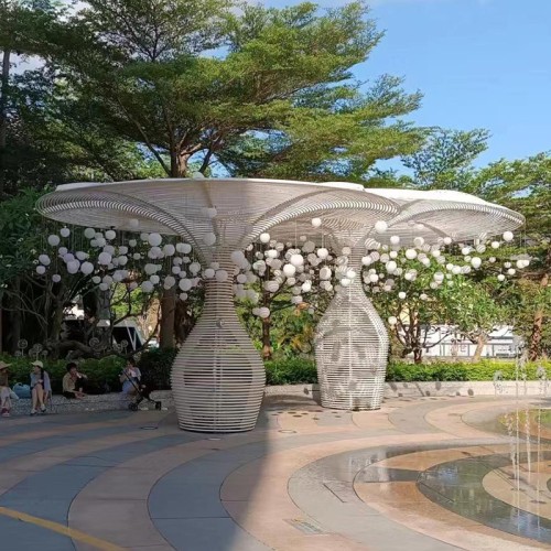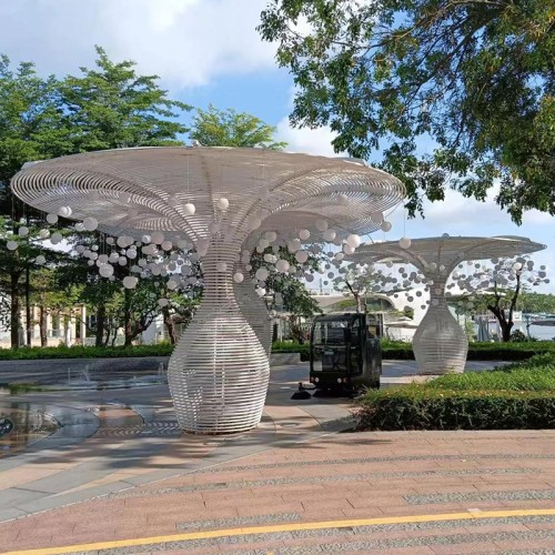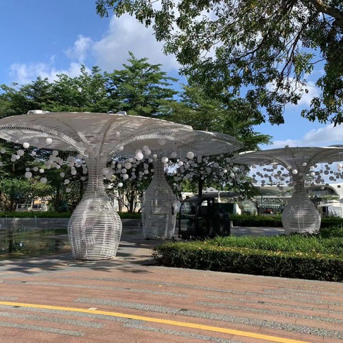 不锈钢廊架树叶造型公园小区异形特色亭子,不锈钢材质具有耐空气、蒸汽、水等弱腐蚀介质和酸、碱、盐等化学浸蚀性介质腐蚀的特性,因为不锈钢雕塑有诸多的优越性,所以很多的城市雕塑以不锈钢材质为材料。